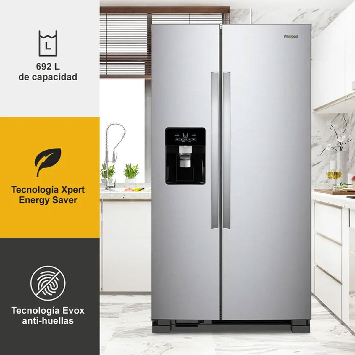 • Con Xpert Energy Saver, el mejor sistema de ahorro de energía y superficie antifingerprint, que evita que se marquen las huellas dactilares en la superficie, además de que lo permite lucir cómo nuevo por más tiempo. Cuenta con dispensador externo de agua y hielo con filtro EveryDrop™ Referencia: N404 Titanio